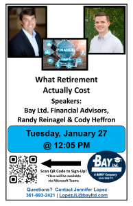 Bay U – Tues., Jan. 27 @ 12:05pm “What Retirement Actually Cost”, Speakers: Randy Reinagel & Cody Heffron by Jennifer Lopez Click Here to Sign Up!